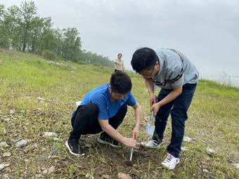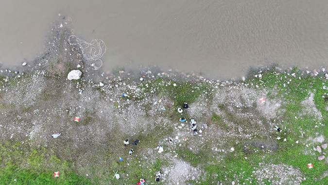 调查内容包括:① 长江中游河岸侵蚀形态、现状以及现场地形地质条件和水力条件;② 长江中游岸坡和水体污染物种类以及分布特征;③ 长江中游河岸防护类型以及植物生长情况:物种组成、分布、功能性状、多样性、形态指标等。此次调研有两个目的地,分别为咸宁市嘉鱼县陆溪口河段邱家湾段和簰洲湾河段。到达目的地后,实验室的师生们迅速展开相关调研工作(图2-4),他们深入实地,采取土样、植物样本、水样等,同时利用无人机、流速仪等设备测量记录现场地形、植物及水力条件等。他们分工明确,紧密合作,协调一致地完成了多个采样点的数据采集,展现出团队对科研工作的严谨。