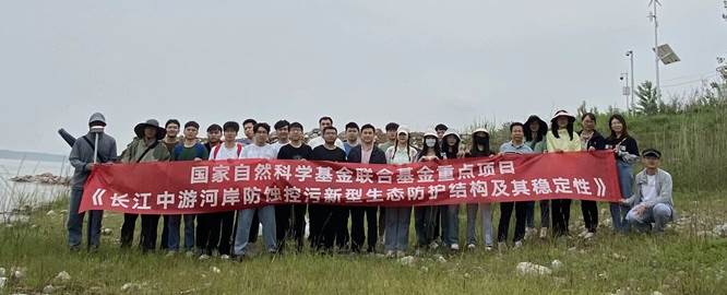 2024年4月25日,在湖北工业大学河湖健康智慧感知与生态修复教育部重点实验室主任肖衡林教授、副主任陶高梁教授的带领下,教育部重点实验室生态修复团队27名师生乘坐大巴车前往长江中游进行实地考察,图1为师生现场合照。本次调研主要开展国家自然科学基金联合基金重点项目的科研工作,现场调研长江中游地区典型河段河岸侵蚀现状、污染物种类及分布特征以及河岸生态防护情况。