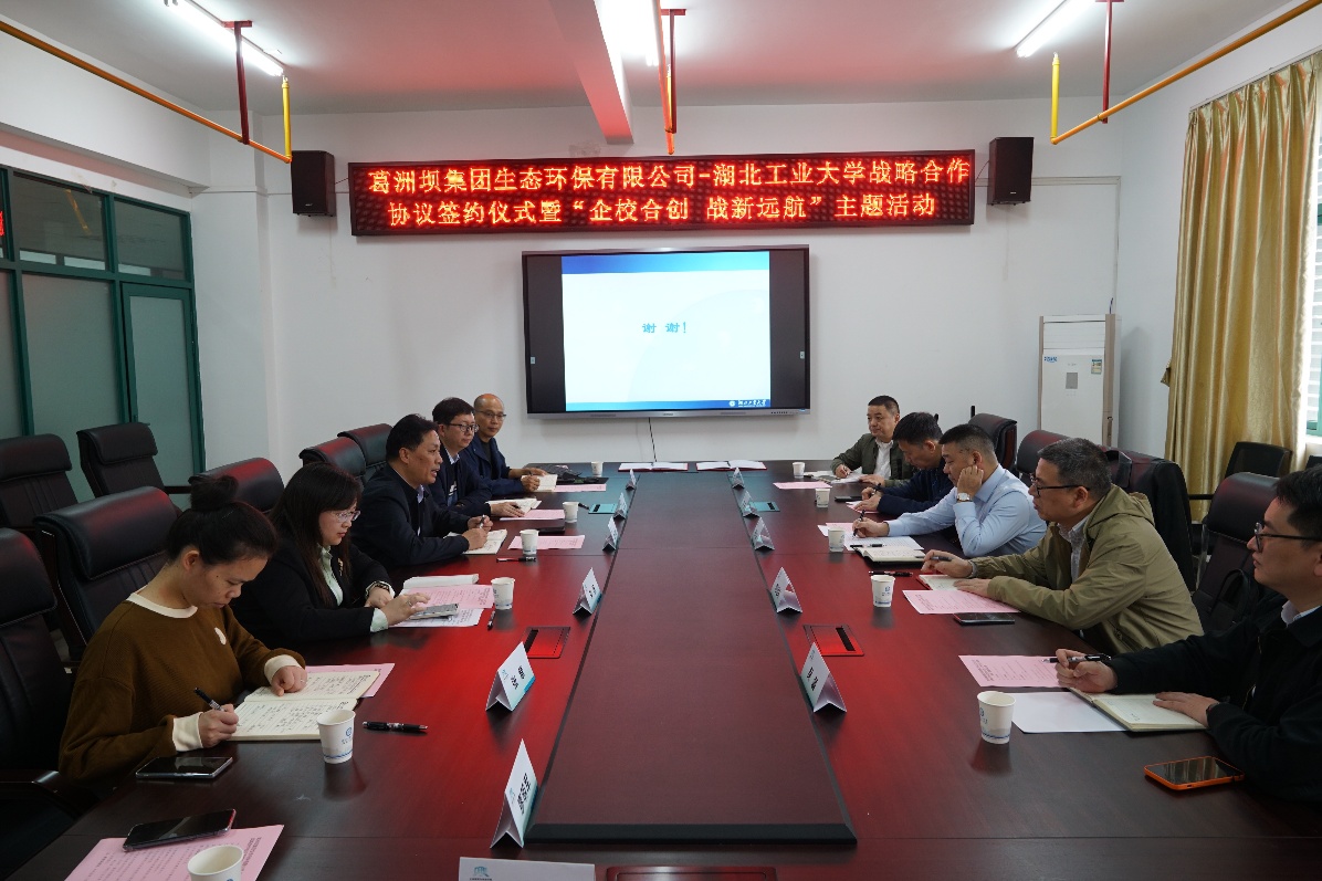 杨火冰对湖北工业大学的热情接待表示感谢。他介绍了葛洲坝生态环保公司作为中国能建葛洲坝集团在生态环境领域的专业工程公司,积极响应国家关于央企聚焦主责主业的号召,重点布局水、土、固废污染治理及新能源等业务,坚持国内与国际市场并重。他表示,未来合作将紧密结合市场需求,推动适用技术研发,加快形成新质生产力,期待双方在技术研发方面积极对接,实现共赢共进。