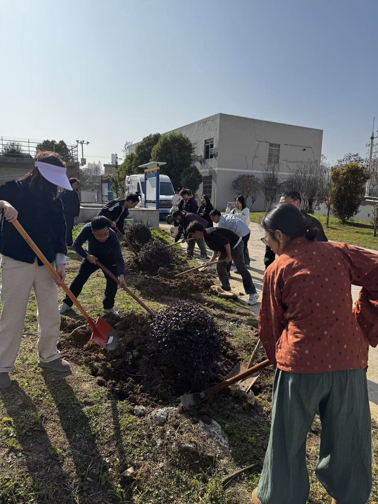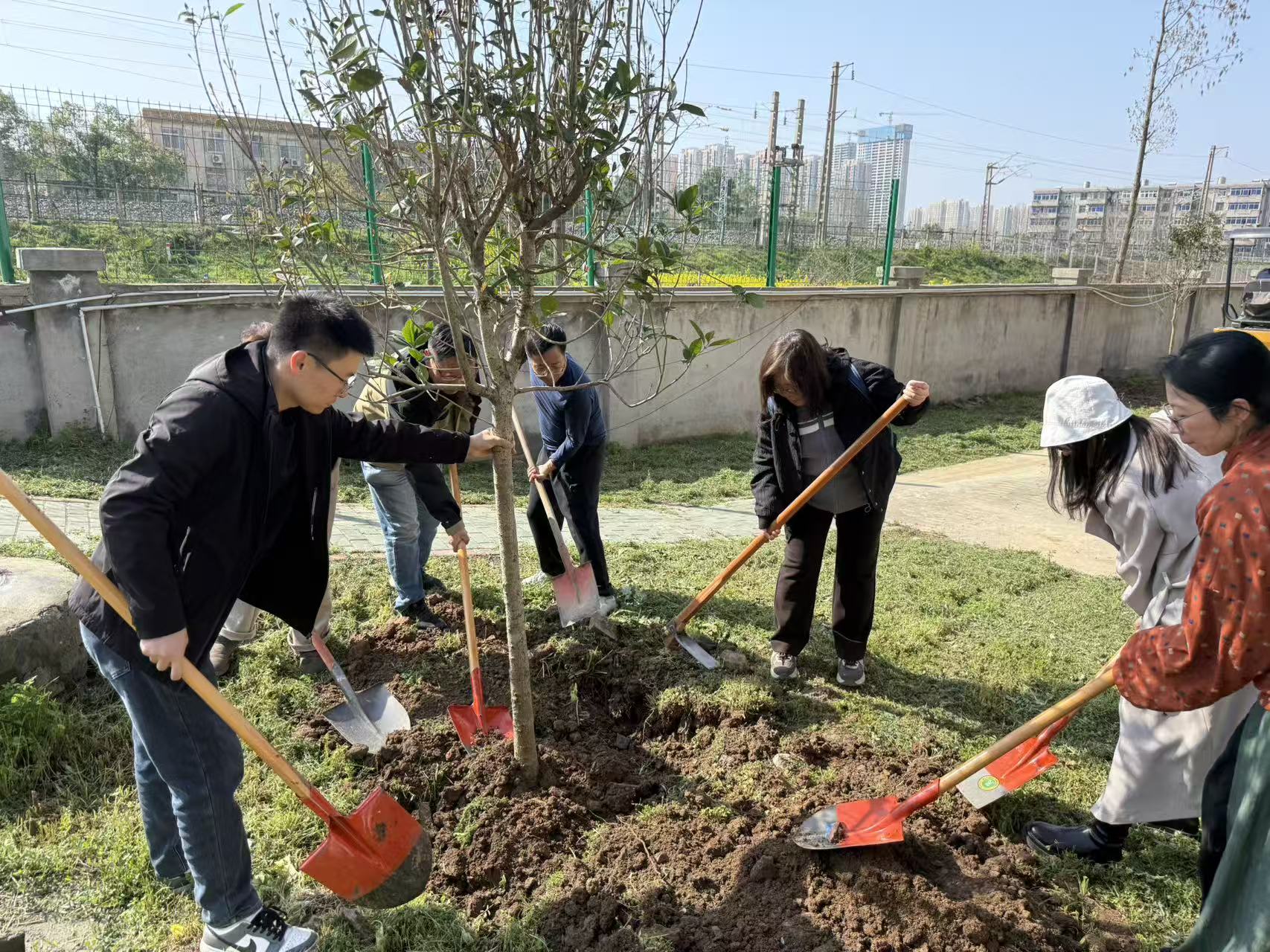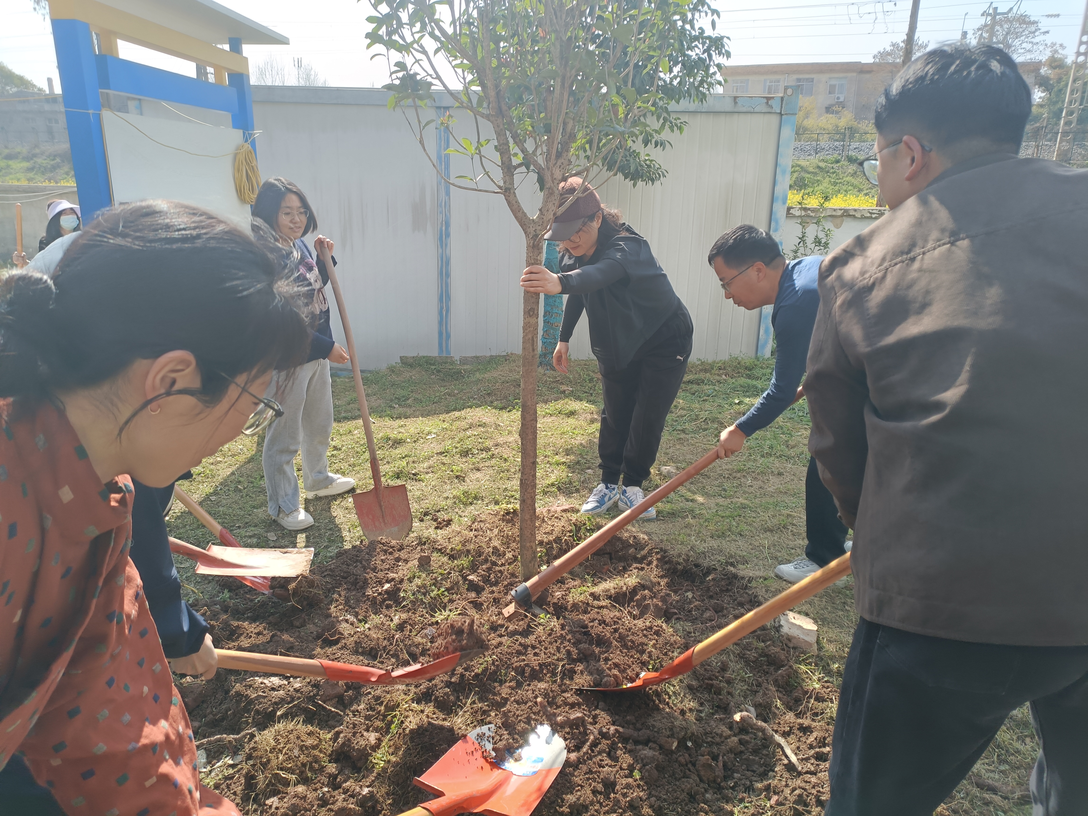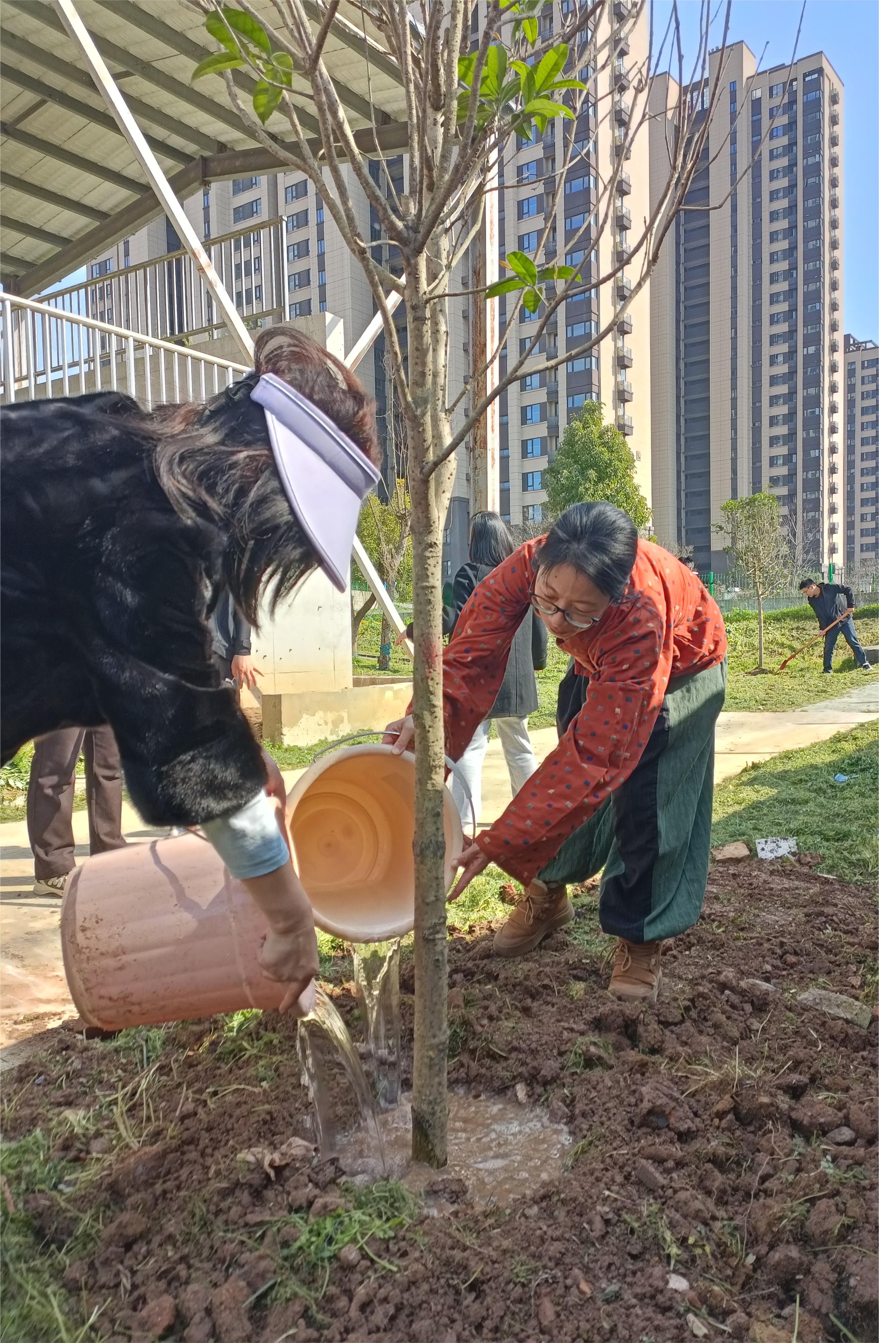 春光里、暖阳下,活动正式展开,大家纷纷挽起袖子,并以组为单位,分工协作,迅速投入植树劳作中:有的挥锹铲土,将坚硬的土壤刨出松软的坑穴;有的扶苗定位,小心翼翼地将树苗扶正摆直,确保根系舒展不弯折;有的培土填坑,一锹一锹将泥土回填至树坑,并用铁锹柄轻轻夯实,让树苗稳稳扎根;还有的提水浇灌,将水分缓缓注入,确保每一株幼苗都灌溉到位。